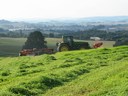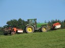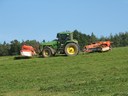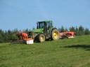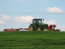 John Deere 8100 s čelně a vzadu taženým mačkačem KUHN