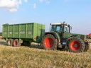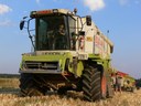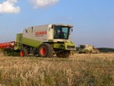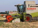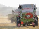 Dva kombajny Lexion 460 při skladaní lišt na přepravní voziky